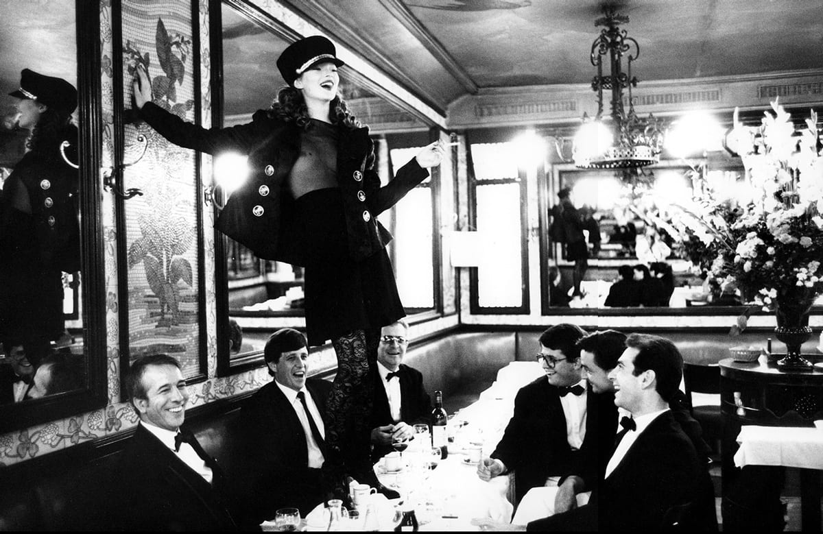 Perhaps nowhere is Elgort’s characteristic style more apparent than in his iconic image of Kate Moss taken at the famed restaurant, Café Lipp in Paris. Included in the September 1993 issue of Italian Vogue, the mood of the image is euphoric, elevated (both literally and figuratively), and joyous. Breaking with convention, Moss seems to be doing whatever she pleases as she is playfully posed with dangling cigarette in hand atop a table surrounded by equally cheerful men. Perhaps they are surprised at her sudden climb on the white tablecloth in the storied restaurant, her laughter reflected in one of its mirrors above the waiters below.